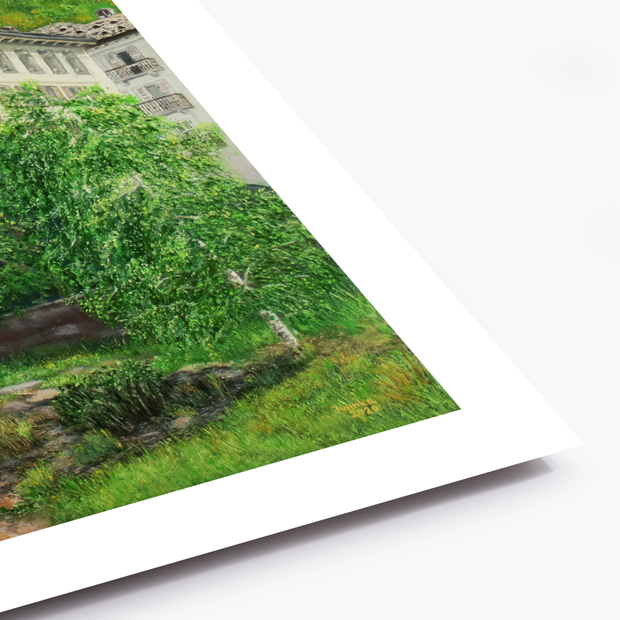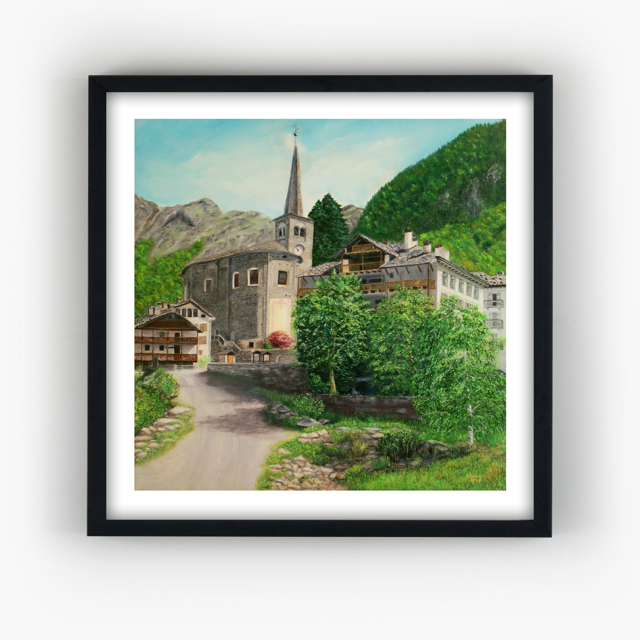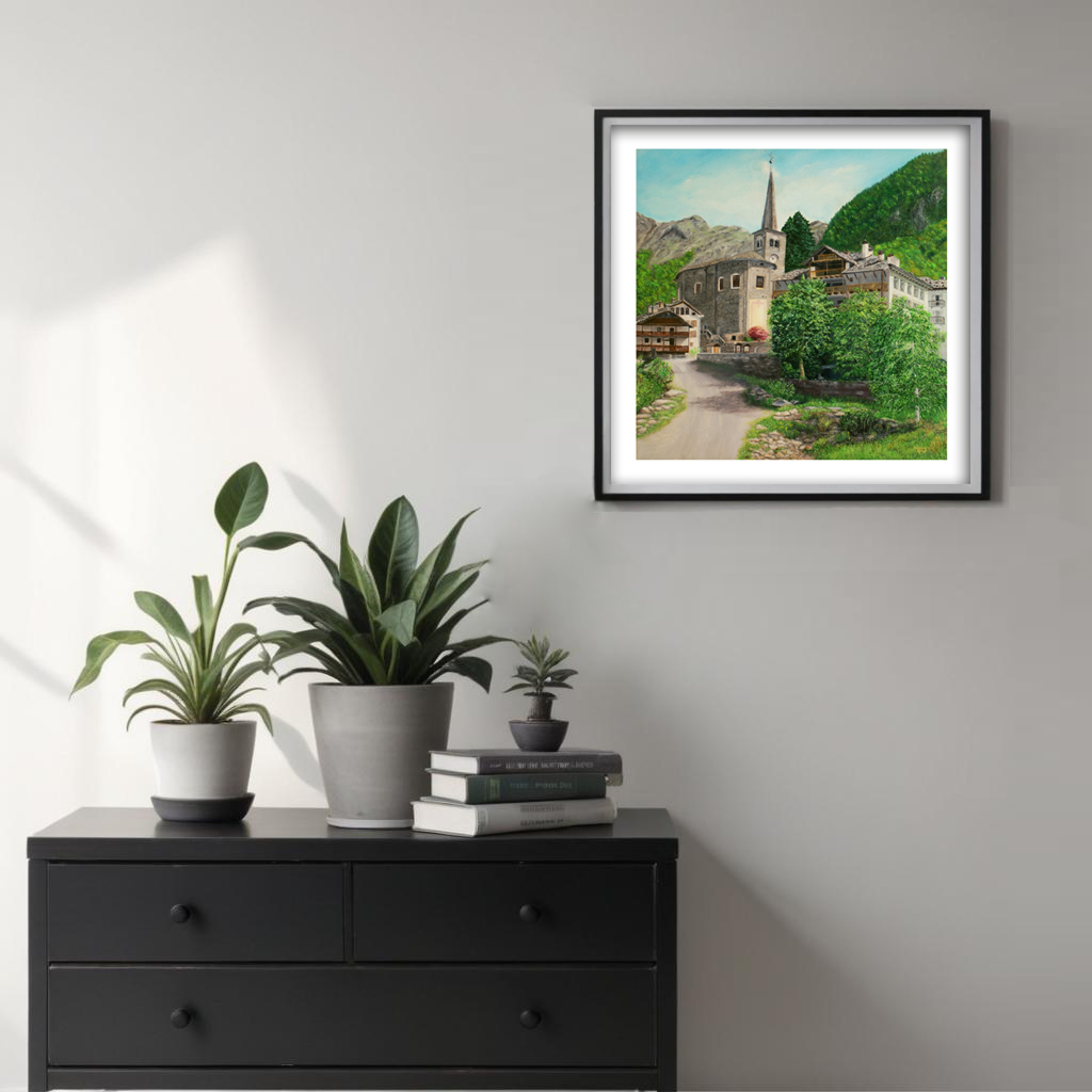 Questa opera nasce come omaggio a Campertogno, uno dei paesi più suggestivi dell’Alta Valsesia, dove storia, silenzio e paesaggio convivono in un equilibrio senza tempo. Al centro della scena si erge la Chiesa di San Giacomo Maggiore, punto di riferimento visivo e spirituale del borgo, perfettamente integrata nel tessuto architettonico e naturale che la circonda.