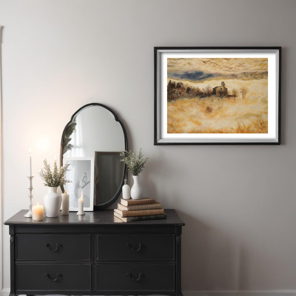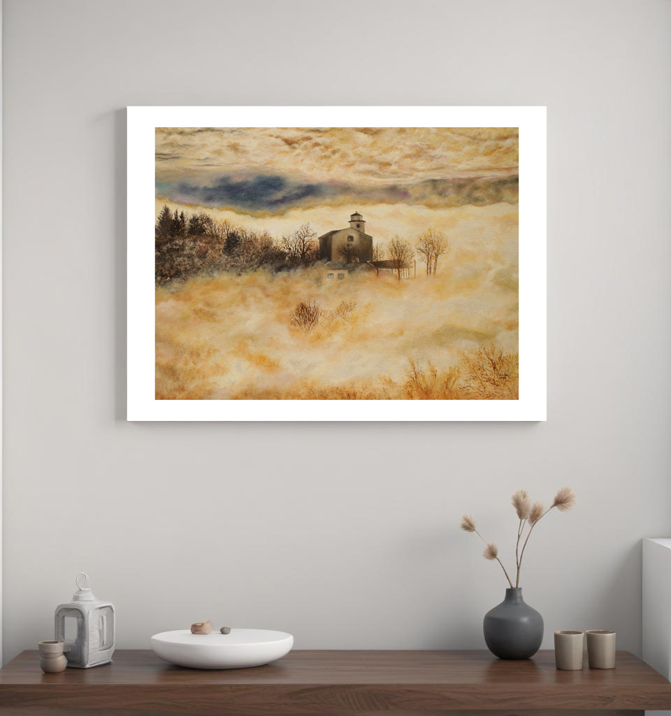Questa stampa da dipinto a olio è un invito a sollevarsi, a osservare il paesaggio dall’alto, dove natura e sacro dialogano in perfetto equilibrio. Un’opera pensata per chi cerca nella montagna non solo bellezza, ma anche silenzio e profondità .