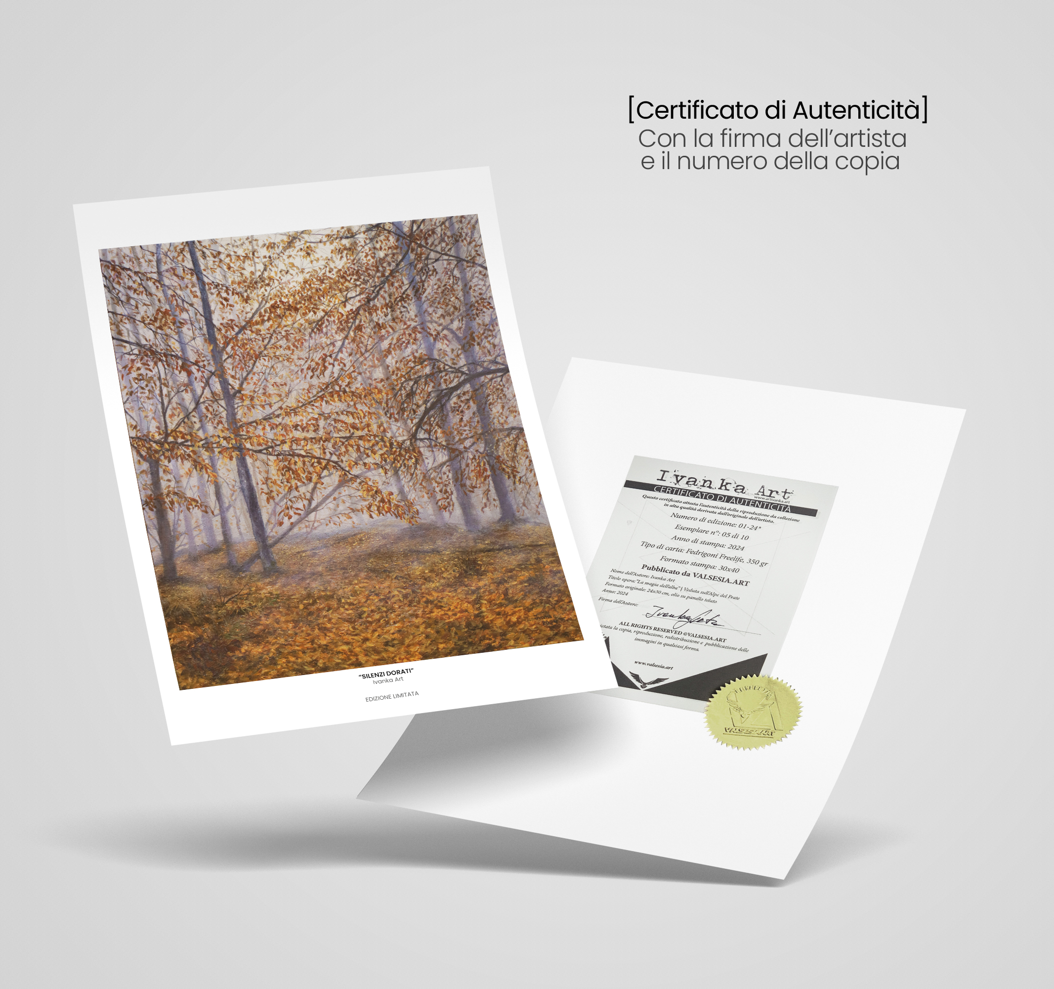 Questa stampa nasce dal cuore silenzioso del Parco Nazionale del Monte Fenera, un luogo dove il tempo rallenta e la natura invita ad ascoltare ciò che spesso dimentichiamo: la quiete. Silenzio Dorato è un’opera che celebra il valore profondo del silenzio, non come assenza, ma come presenza piena e avvolgente.