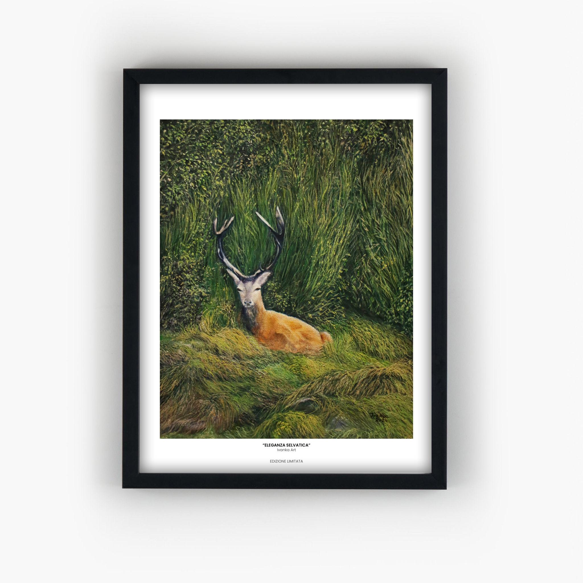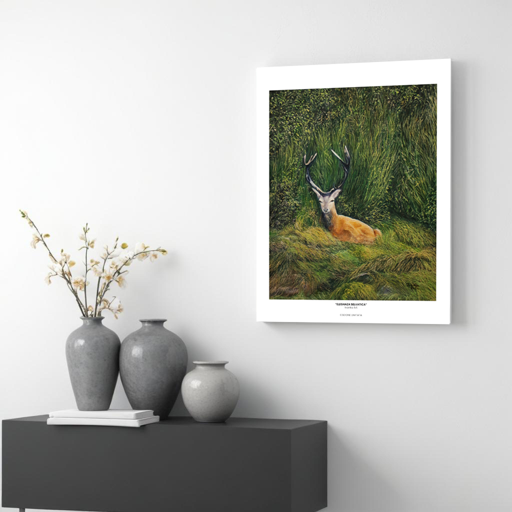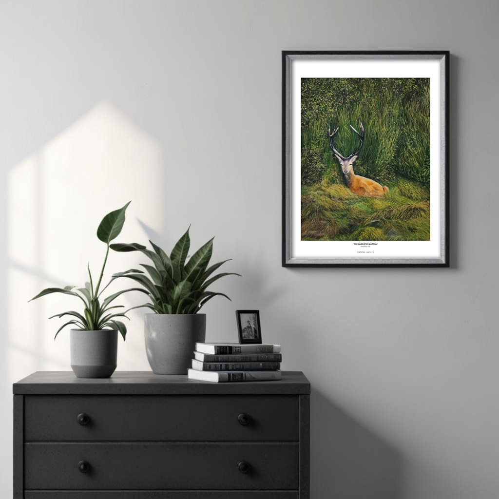Questa stampa nasce da un incontro silenzioso, di quelli che capitano solo quando la montagna decide di farsi generosa. Un giovane cervo riposa nell’erba alta, immerso nei colori caldi dell’autunno, mentre il bosco intorno si veste di sfumature dorate e ambrate.