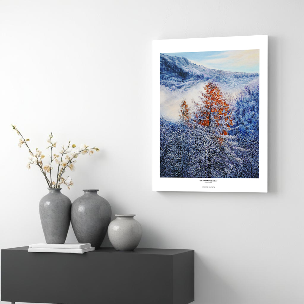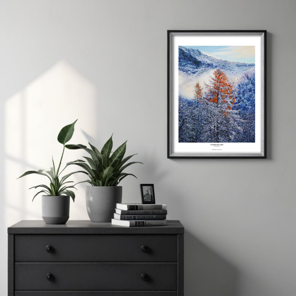 Questa stampa, tratta dal dipinto originale a olio e realizzata in tiratura limitata, è pensata per chi cerca un’immagine capace di portare luce, profondità e meraviglia naturale nei propri spazi. Un invito quotidiano a rallentare e lasciarsi attraversare dalla magia dell’alba.