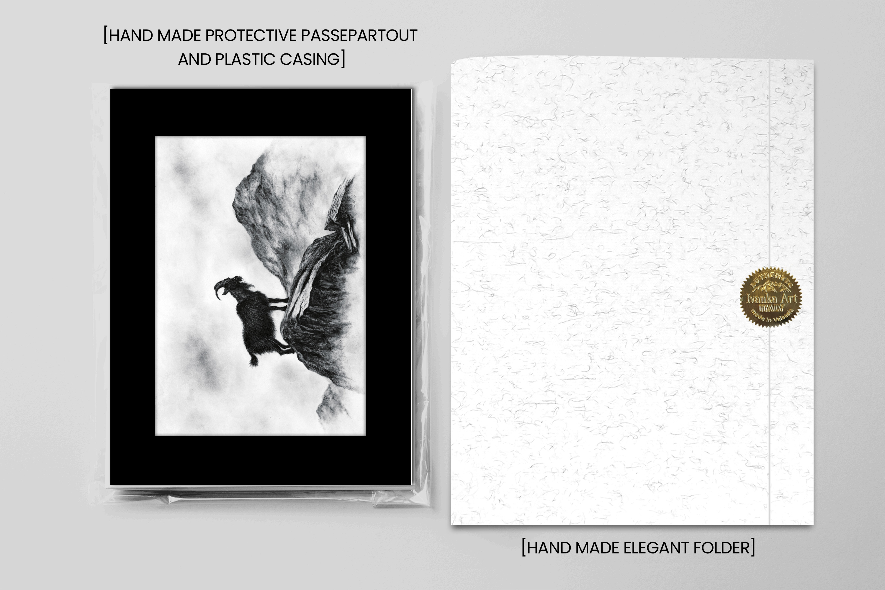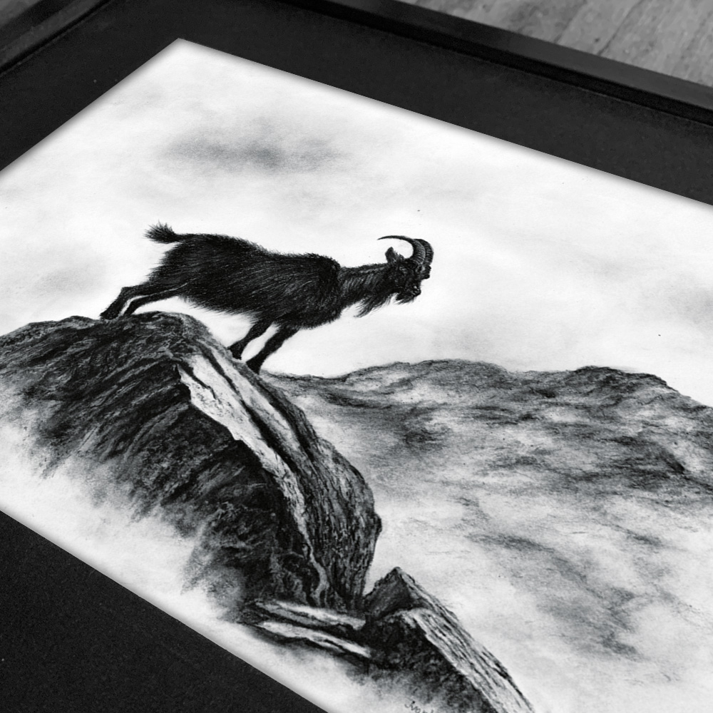 Attraverso le sfumature del carboncino, l’artista cattura la potenza silenziosa dell’animale: le corna si stagliano fiere verso il cielo, il corpo saldo sulla roccia sembra fondersi con la terra stessa. Ogni tratto restituisce la sensazione dell’altitudine, dell’aria sottile e del rispetto che suscita la natura incontaminata.