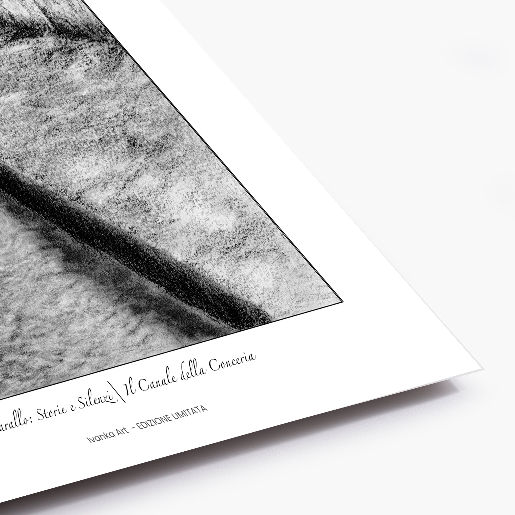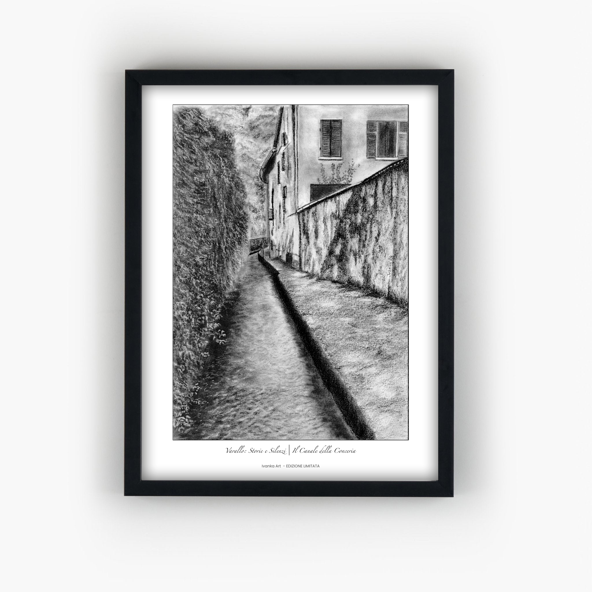 Un disegno a carboncino che racconta la poesia di un angolo nascosto di Varallo, dove il tempo sembra essersi fermato. Il canale, ultimo segno di un’antica conceria ormai scomparsa, scorre silenzioso tra le pietre, custodendo la memoria di un passato lontano.
