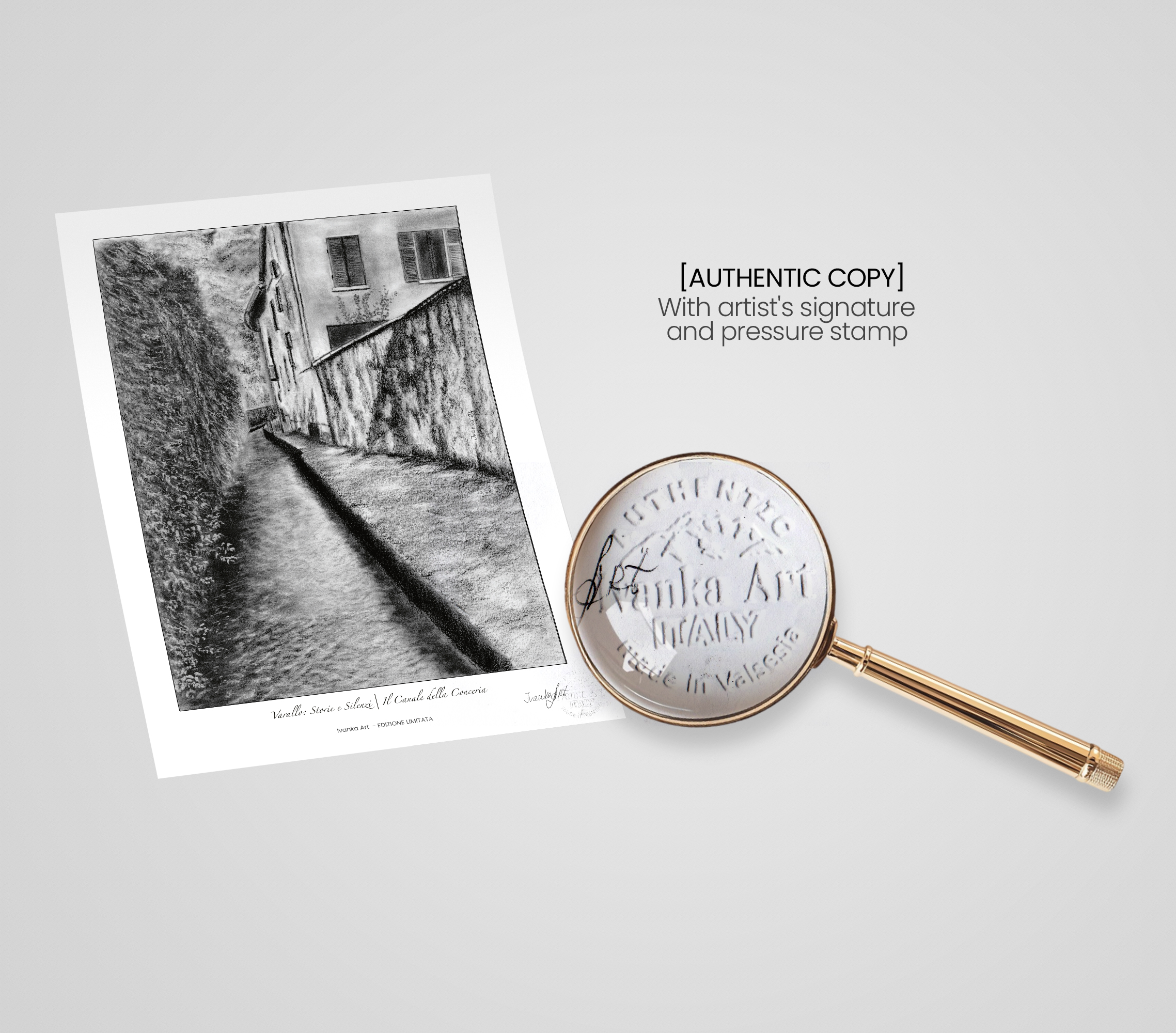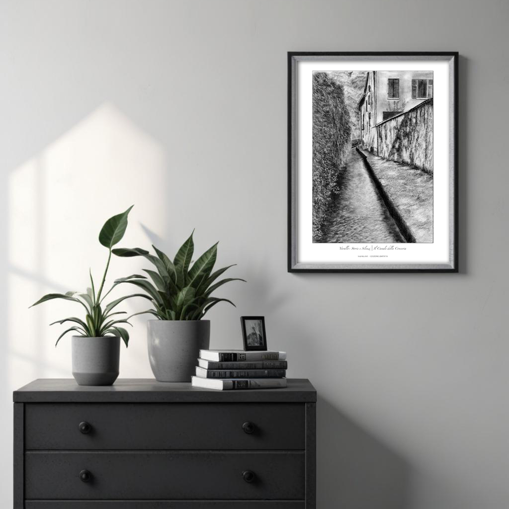 Le sfumature del carboncino restituiscono la delicatezza e la quiete di questo luogo dimenticato, dove ogni dettaglio parla di storia e autenticità . Questa stampa d’arte celebra la bellezza nascosta di Varallo, un invito a scoprire ciò che rimane, e continua a vivere, dietro ogni angolo.