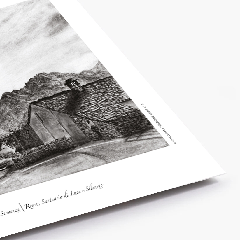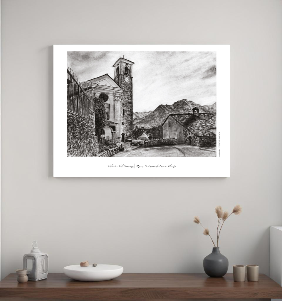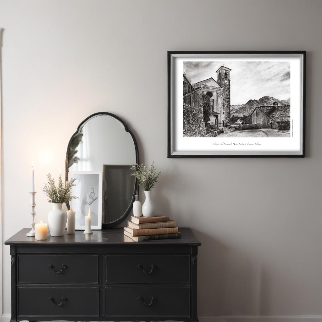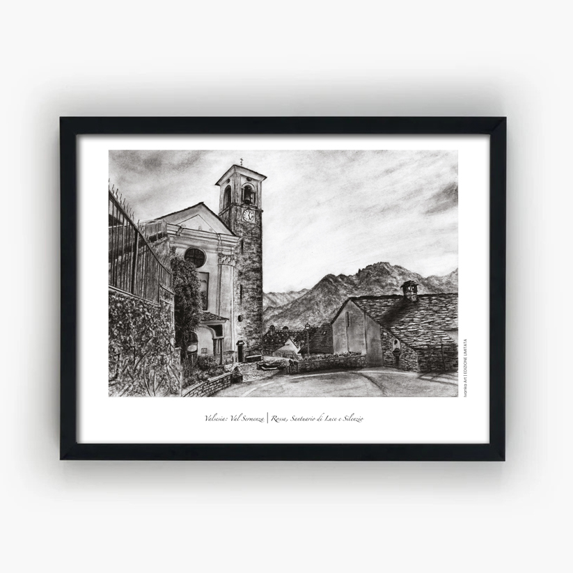 Questa stampa a carboncino rappresenta la Chiesa Parrocchiale di Maria Vergine Assunta a Rossa, un gioiello del XVIII secolo immerso nella quiete della Val Sermenza. L’opera cattura la luce unica che illumina il borgo, mettendo in risalto la struttura della chiesa e la sua armonia con il paesaggio circostante.