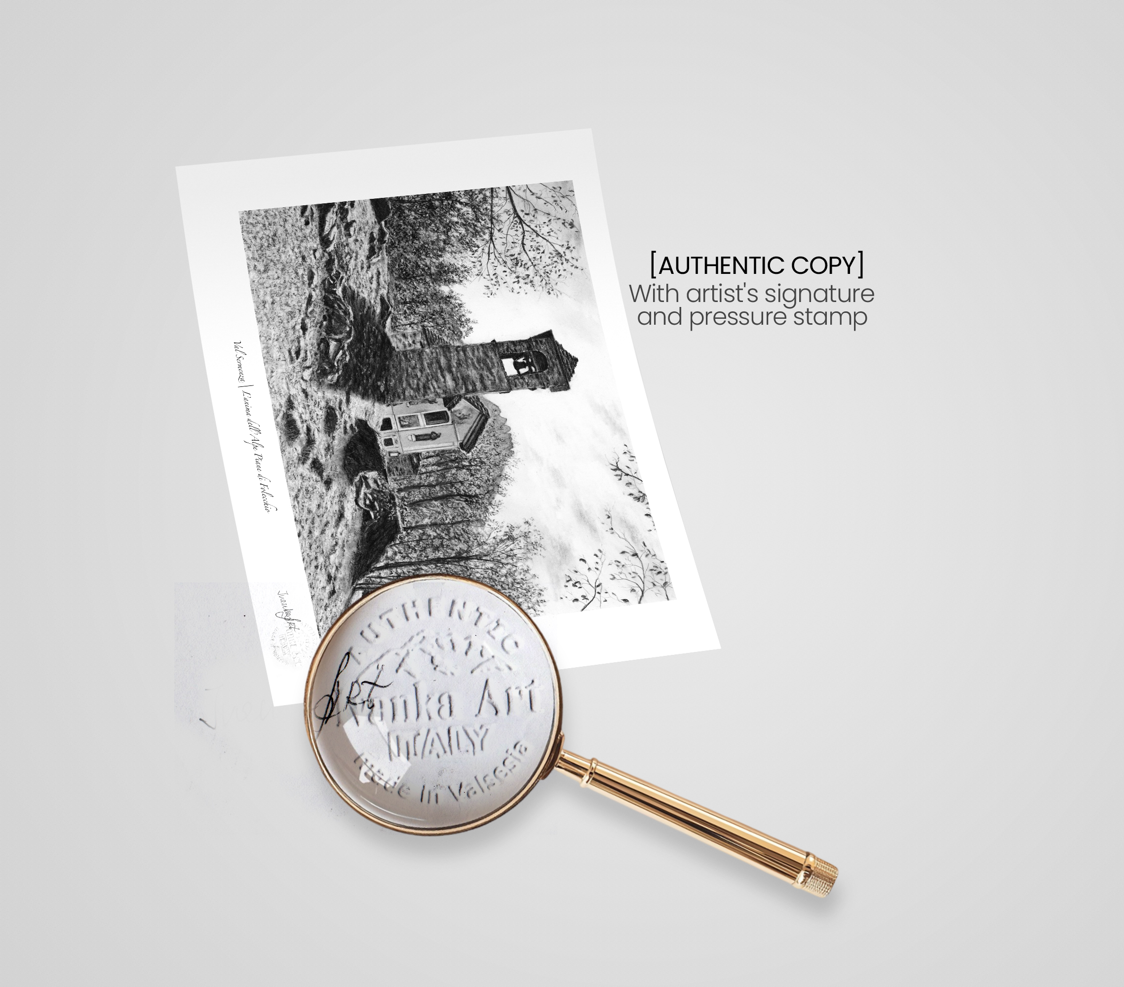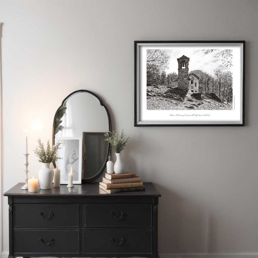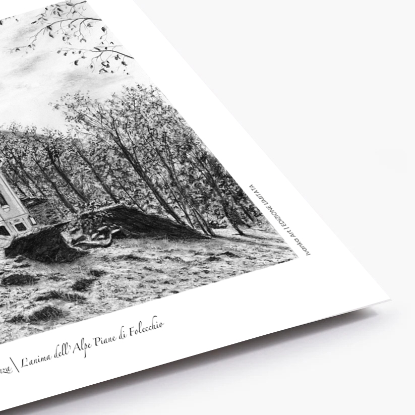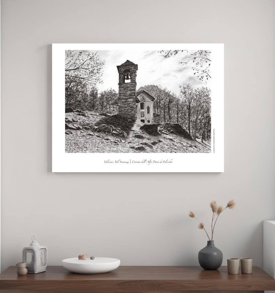 Questa stampa a carboncino ritrae l’oratorio di San Giacomo e San Francesco di Sales, incastonato nell’Alpe Piane di Folecchio, un angolo suggestivo del comune di Rossa. Il campanile, isolato dalle altre costruzioni, sembra dialogare con il cielo, mentre sullo sfondo i Denti di Gavala conferiscono al paesaggio un’atmosfera di mistero e magia.
