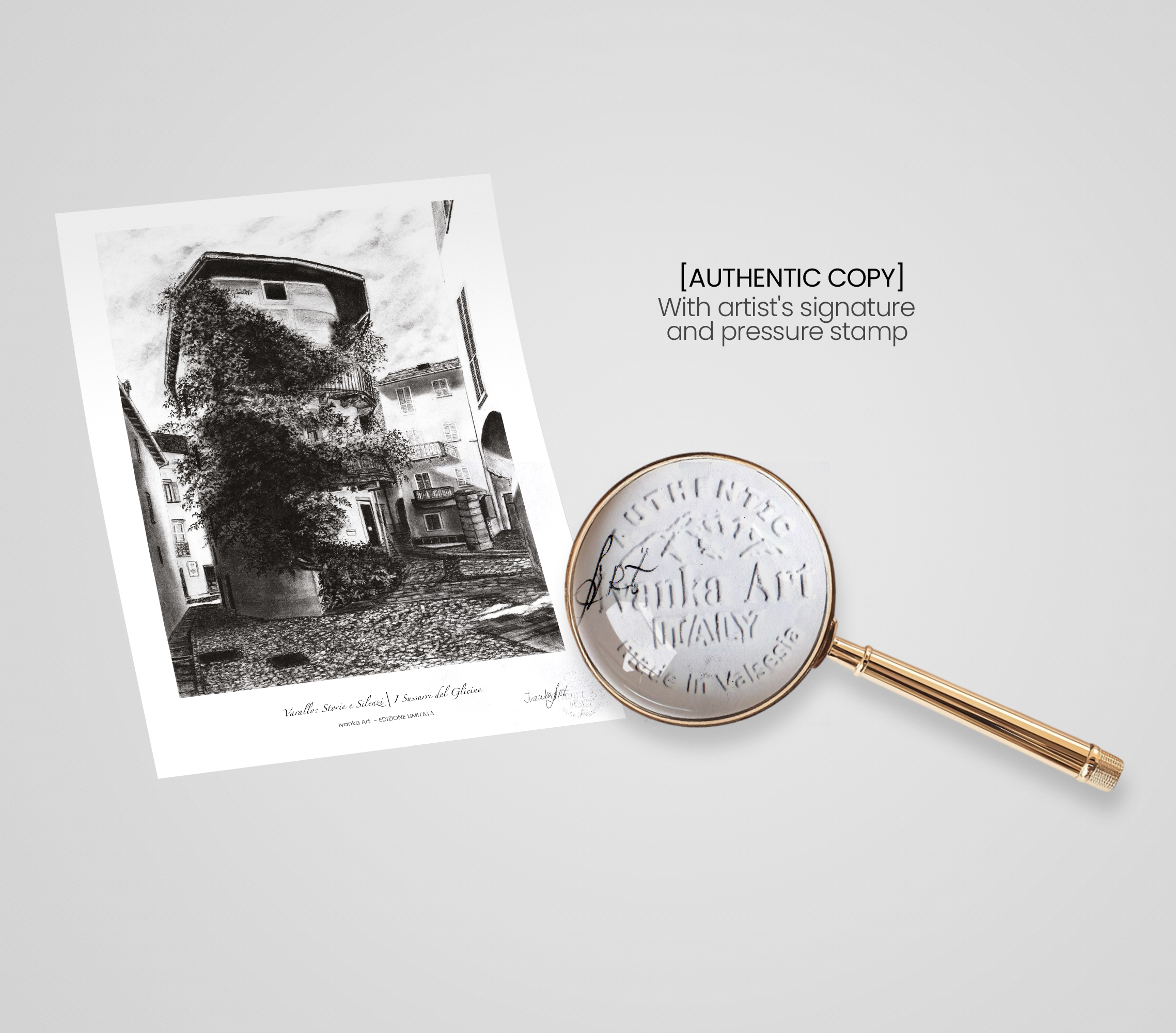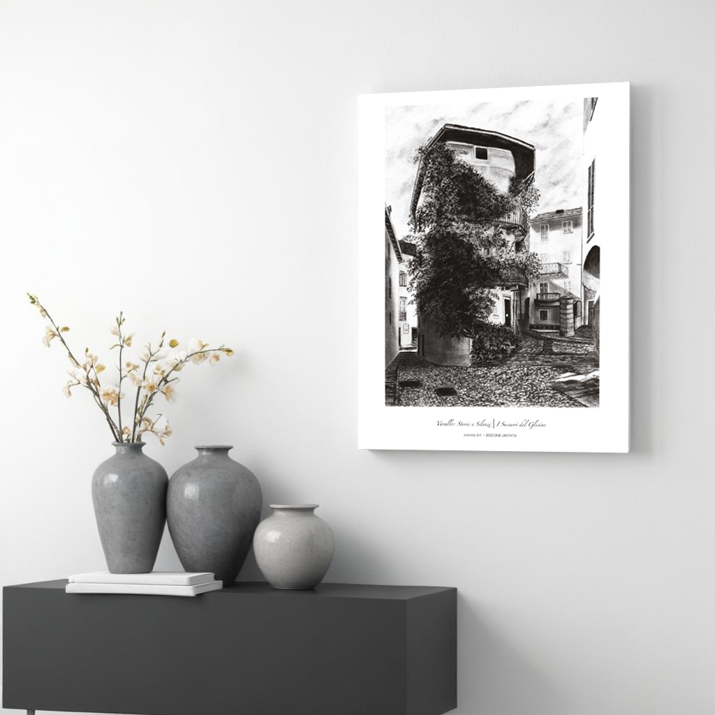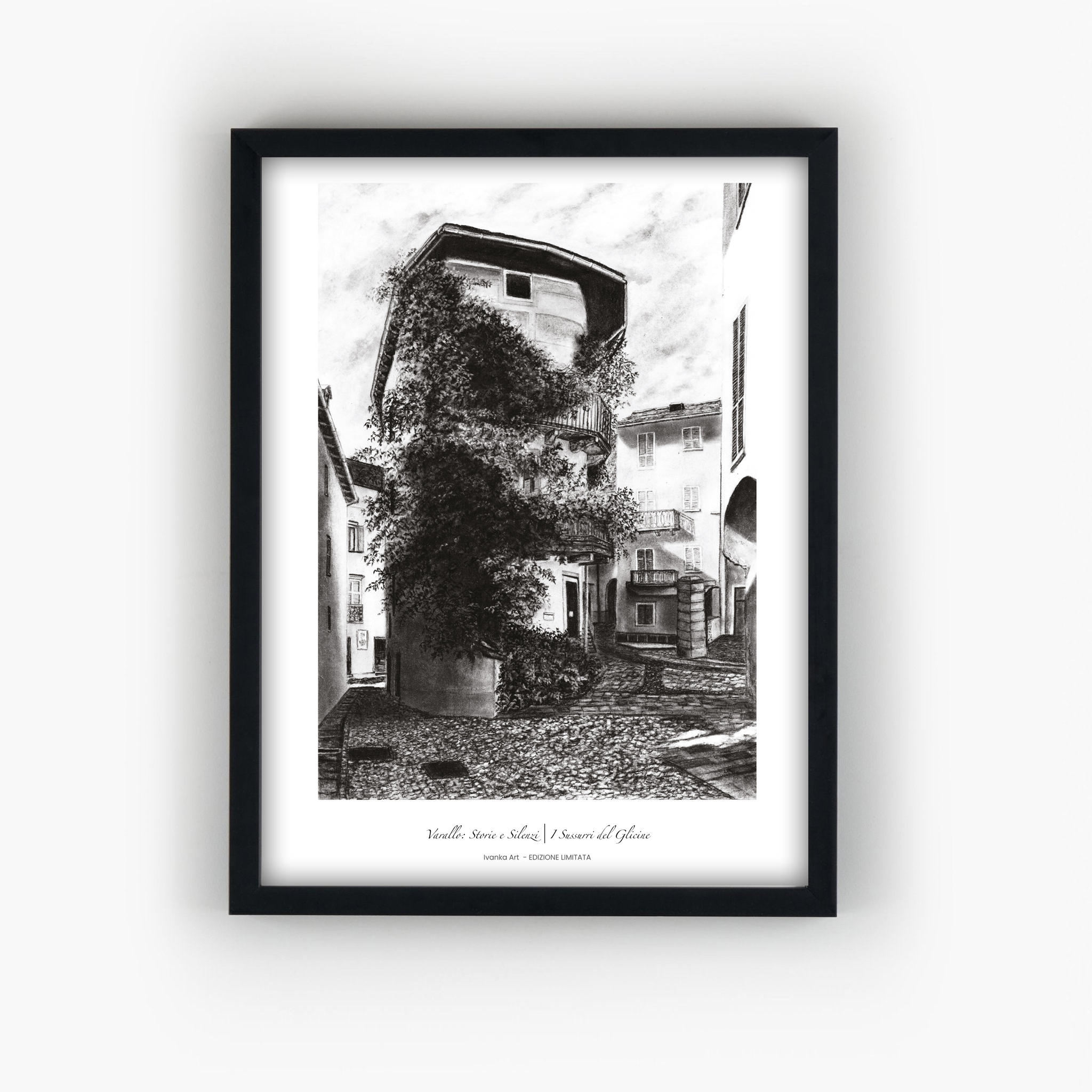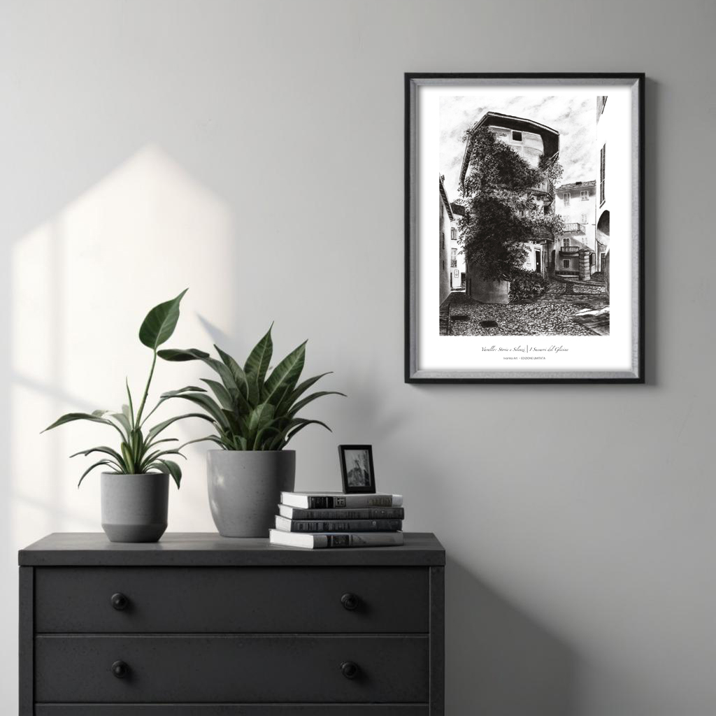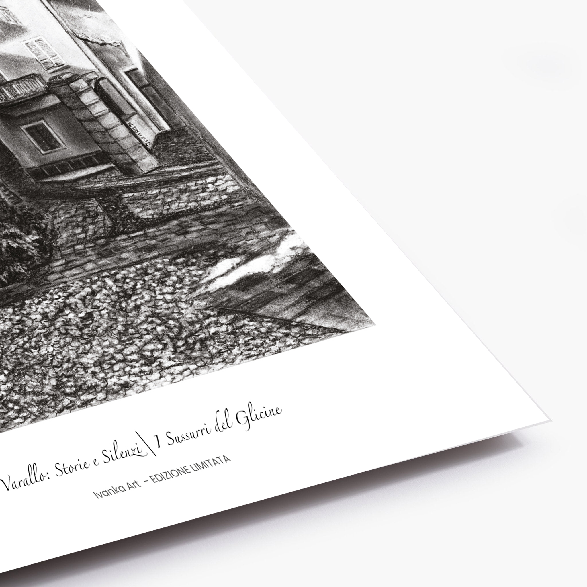 In questo disegno a carboncino, l’antico cuore di Varallo si rivela attraverso la quieta eleganza di un palazzo storico, abbracciato da un rigoglioso glicine. Ogni ramo che si intreccia sulle pietre sembra custodire memorie e voci lontane, restituendo l’atmosfera intima di un tempo sospeso. Con le sue sfumature delicate e i giochi di luce tra architettura e natura, quest’opera invita a fermarsi, ad ascoltare e a lasciarsi avvolgere dal fascino discreto di un luogo dove la storia si intreccia al silenzio.
