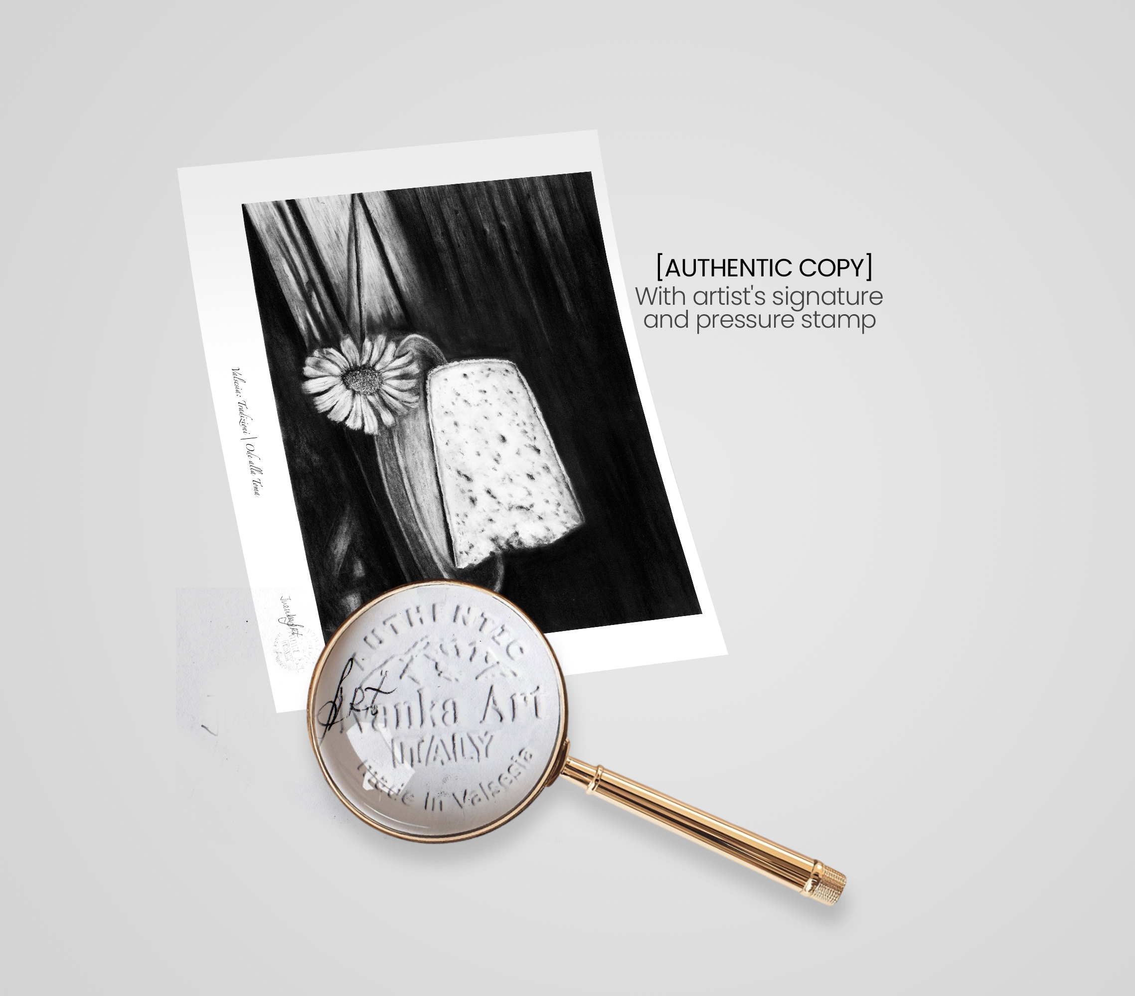 Il carboncino ne accarezza la superficie, restituisce la sua ruvidità sincera e richiama, senza bisogno di parole, i pascoli alti, l’aria sottile e il ritmo lento che dà forma ai sapori più veri. Accanto, un piccolo fiore di campo aggiunge un soffio di poesia: è il filo che unisce la terra, il latte, il lavoro attento e la grazia spontanea della natura alpina.