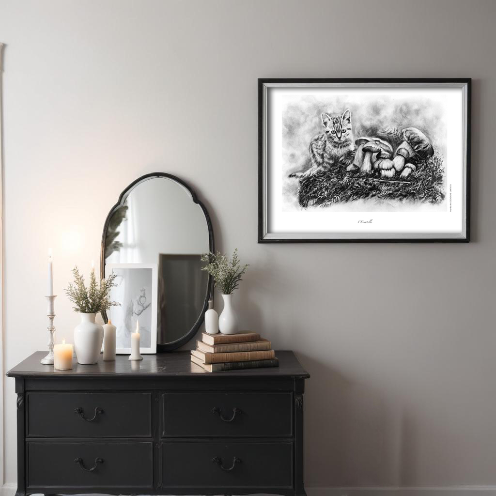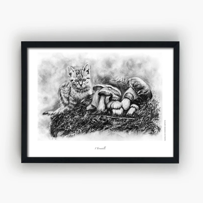 In questa scena delicata, un gattino curioso si imbatte in un mucchietto di funghi appena raccolti, posati su un tappeto di felci e foglie scure. Non c’è selvaticità , solo attenzione, stupore, quella meraviglia semplice che appartiene agli incontri inaspettati.