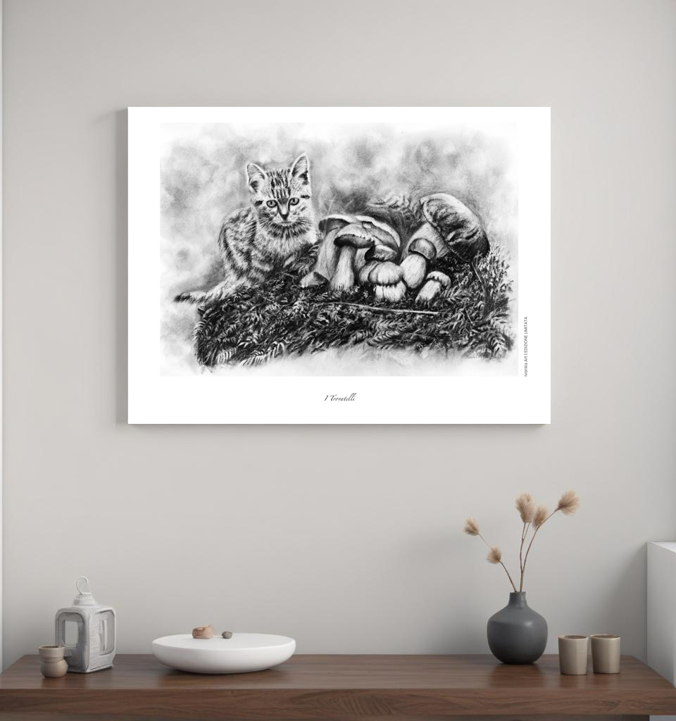 Il suo sguardo vigile segue i contorni morbidi dei cappelli, illuminati da un leggero tocco di colore che li rende un piccolo tesoro del bosco. Il chiaroscuro scolpisce la terra, il pelo, le forme, creando un’atmosfera intima e silenziosa, come se il tempo si fosse fermato per un istante.