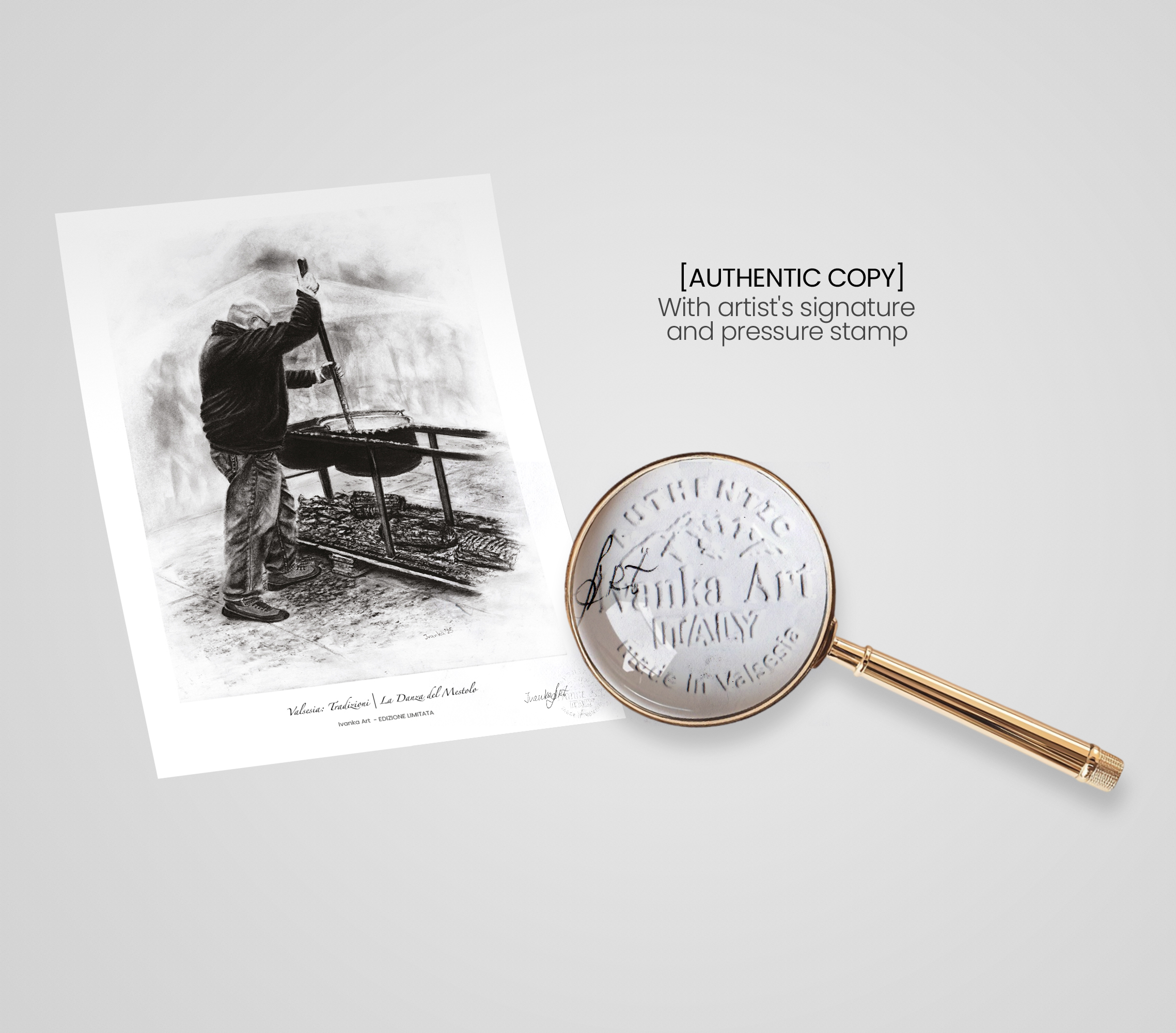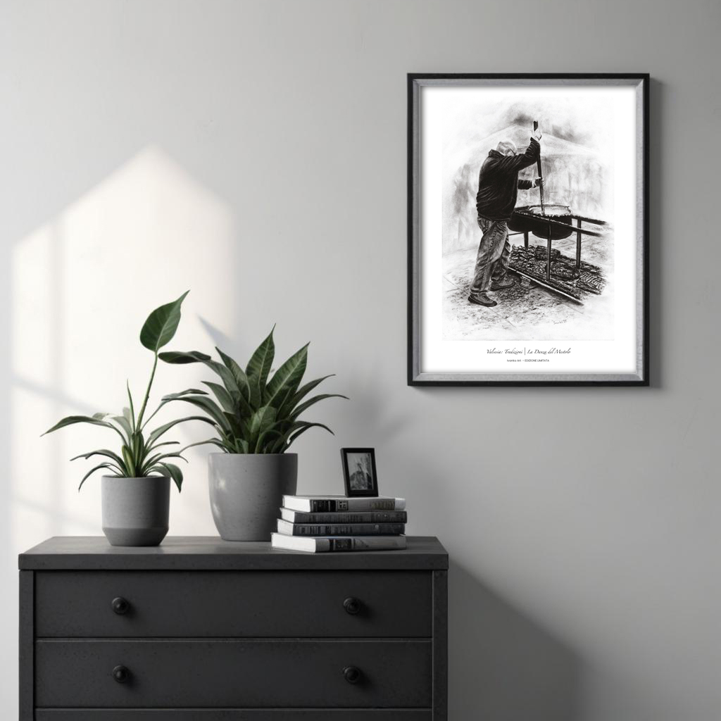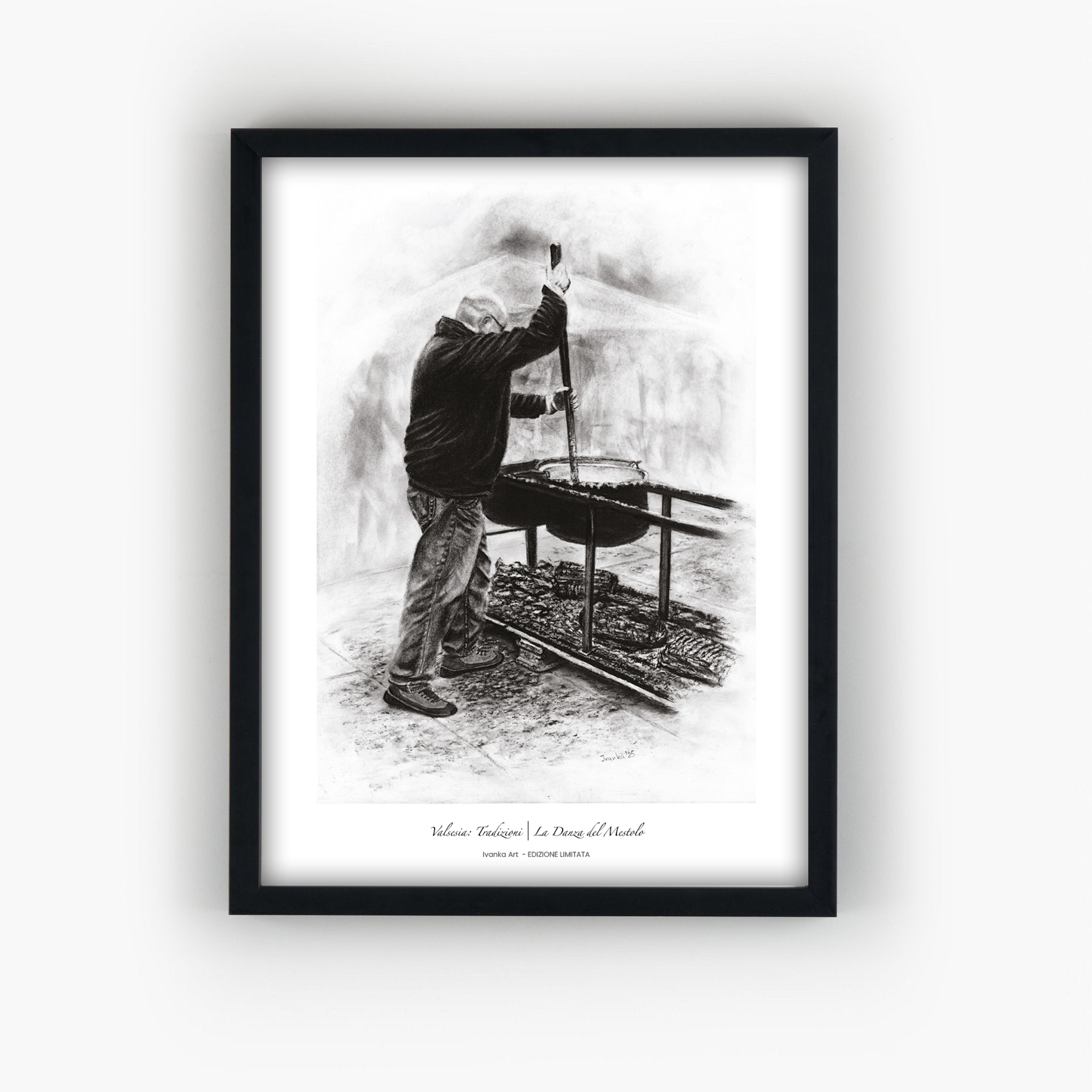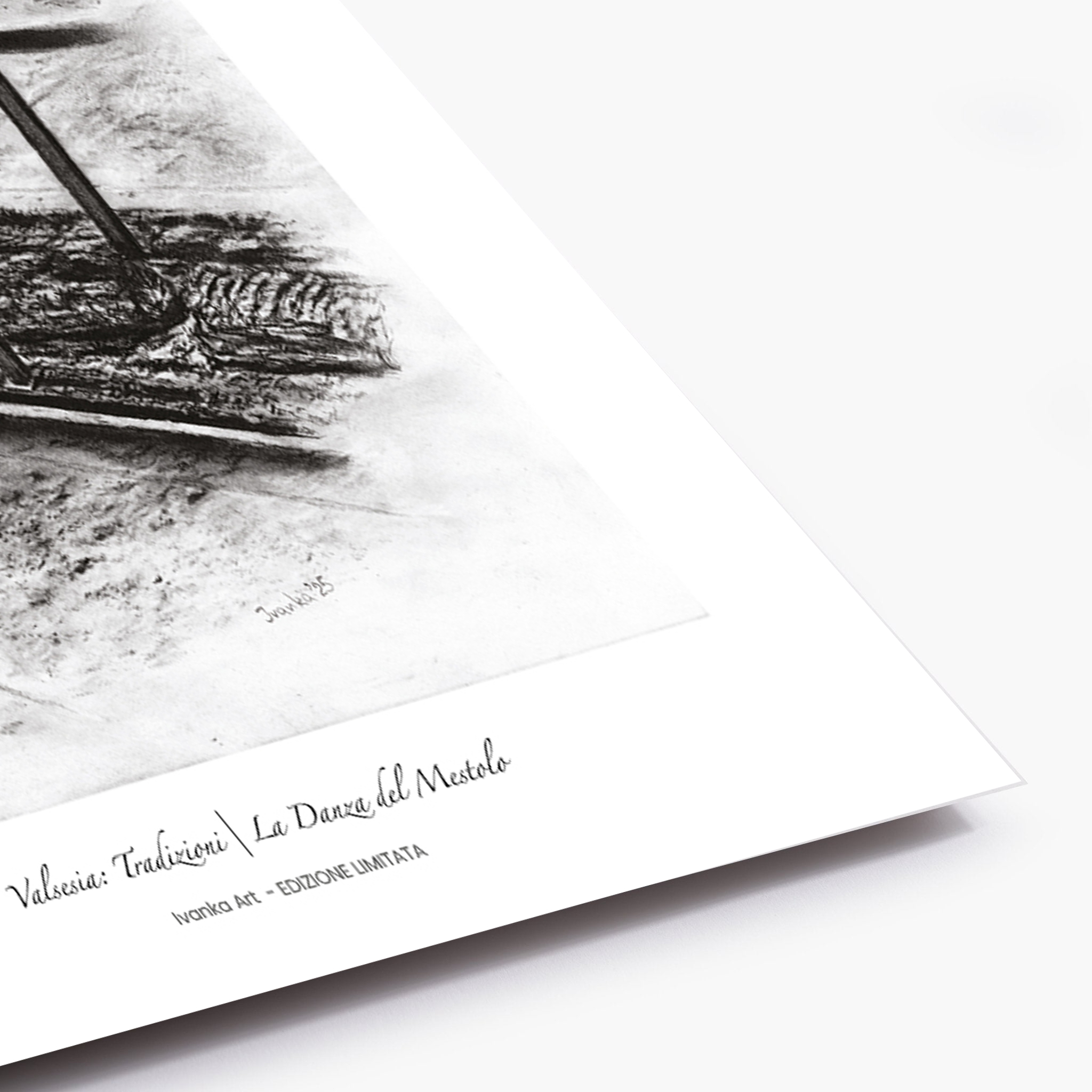 Questa stampa a tiratura limitata riproduce l’opera originale a carboncino dedicata a uno dei momenti più vivaci della tradizione valsesiana: la preparazione collettiva dei piatti tipici durante le feste di paese. Il disegno cattura l’energia e il ritmo del gesto antico, mentre il mestolo si muove con maestria nel grande paiolo sospeso sul fuoco.