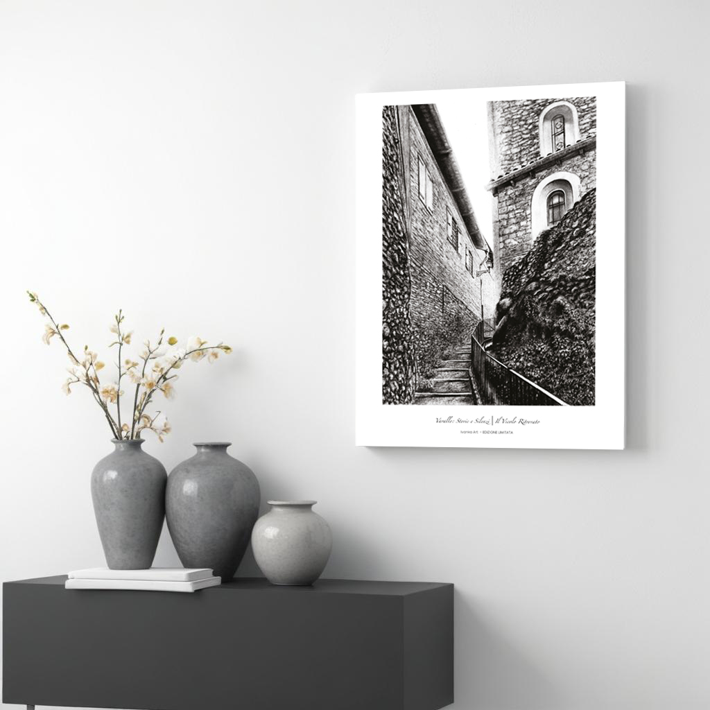 Questo disegno a carboncino ritrae uno degli angoli più nascosti di Varallo, un vicolo silenzioso che si cela dietro la Chiesa di Sant’Antonio da Padova e conduce, con il suo percorso discreto, verso il fiume Sesia.